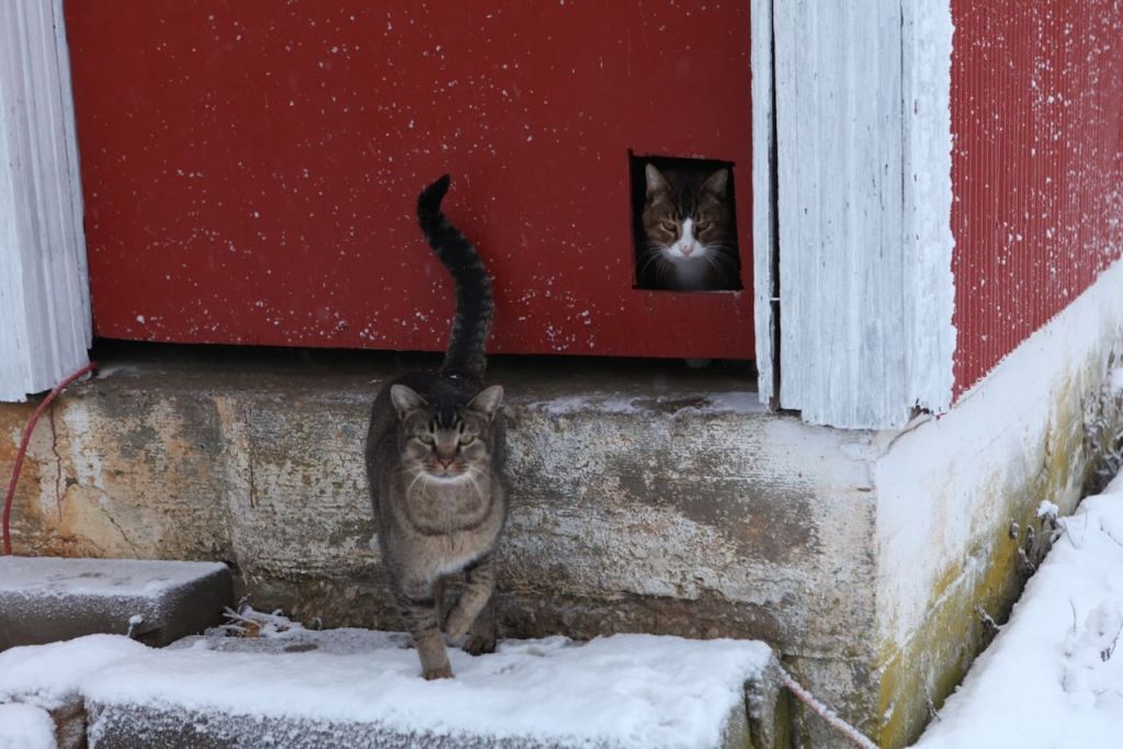 The cats were easy: two of them live in the well house, and sleep cozily in a south window, and the other two nest in hay in the barn. We’re just upping their food a bit.