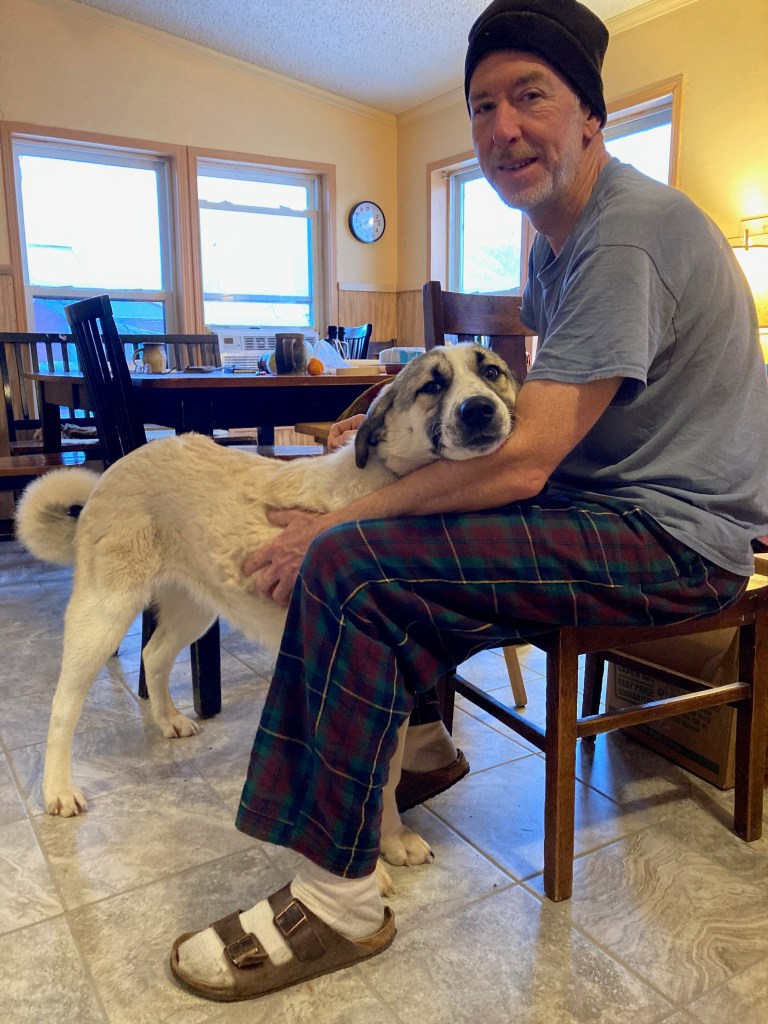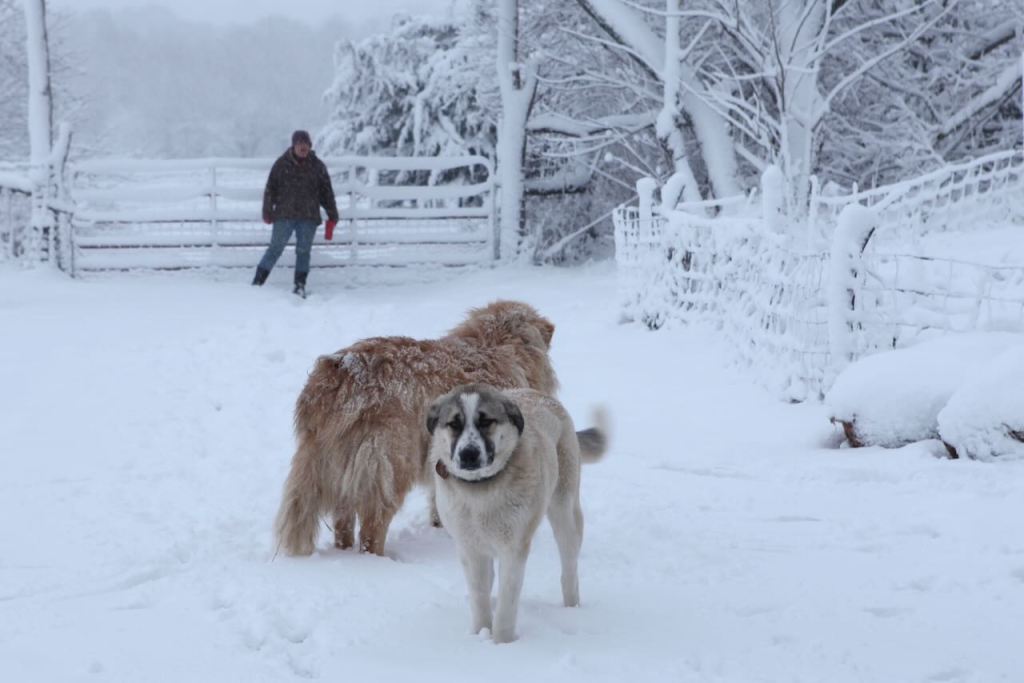 But the dogs–what to do about the dogs? Our two farm dogs, the old one that came with the farm and the young one that is only 7 1/2 months old are livestock guardian dog breeds. Neither are house dogs. They have large body masses and thick thick double coats, and have been completely unbothered by normal winter temperatures. They seek out sheltered places to sleep (currently on the lee side of the big hay bales we never moved up into the sheep pastures), make their rounds regularly, and are happy happy happy in the snow. But -14F with windchills at -35F seems a little much. The older one’s coat isn’t as good as it should be, and the young one is young.