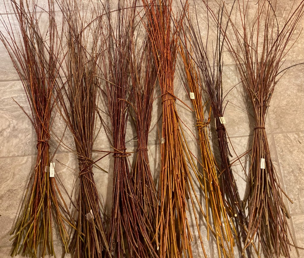 Dicky Meadows: This is supposed to be one of the standards of basket-making. I started with 5 cuttings in 2023. The first year, they produced very skinny lovely long slender rods, but not very many of them and many of them were branching. They were the color of dark red kidney beans. The second year they went nuts! They grew much better, much taller, and much thicker. I got over 100 good-sized cuttings for propagation. The tip ends I used last year were beautiful to weave with; I can imagine what a joy full rods will be.