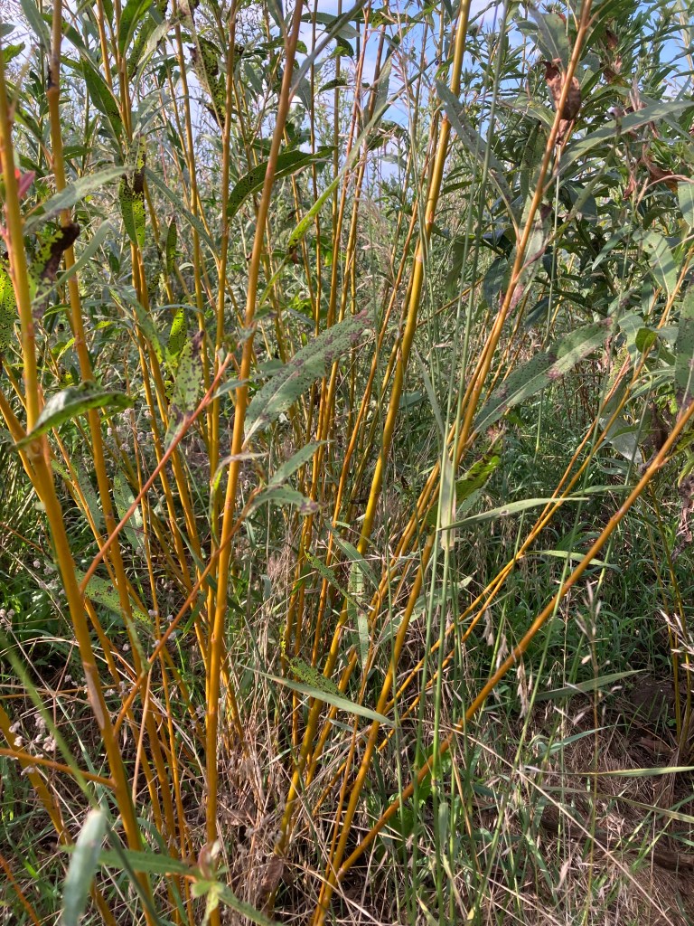 In 2022 I planted my first five varieties of basketry willows, from Willowglen Nursery. The owners were very helpful, and talked to me at length on the phone . Unfortunately, I planted them too far away from my main garden for the hose to reach, and in the midst of some really persistent fescue grass as well as perennial dogbane and Kansas’s enthusiastic wild sunflowers, and so it’s taken awhile for them to get established, but even with what I would consider extreme neglect, in the pretty harsh summer environment of NE Kansas, those 25 cuttings have grown into significant stools.
