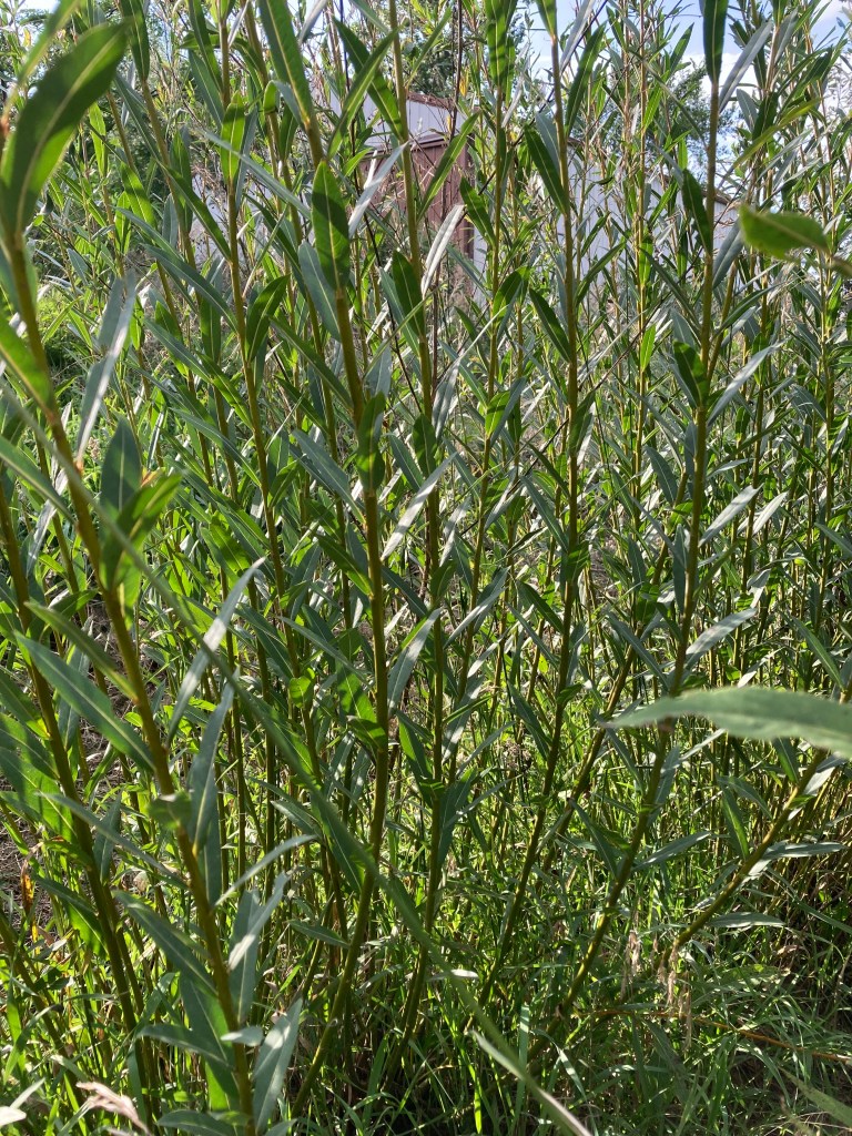 No clue what the giant willow trees behind the shop and along the fenceline are. They drop branches all the time. We’ve been hacking at the ones behind the shop because we don’t want them to destroy the shop roof. The subsequent year rods are weavable, but a bit brittle.